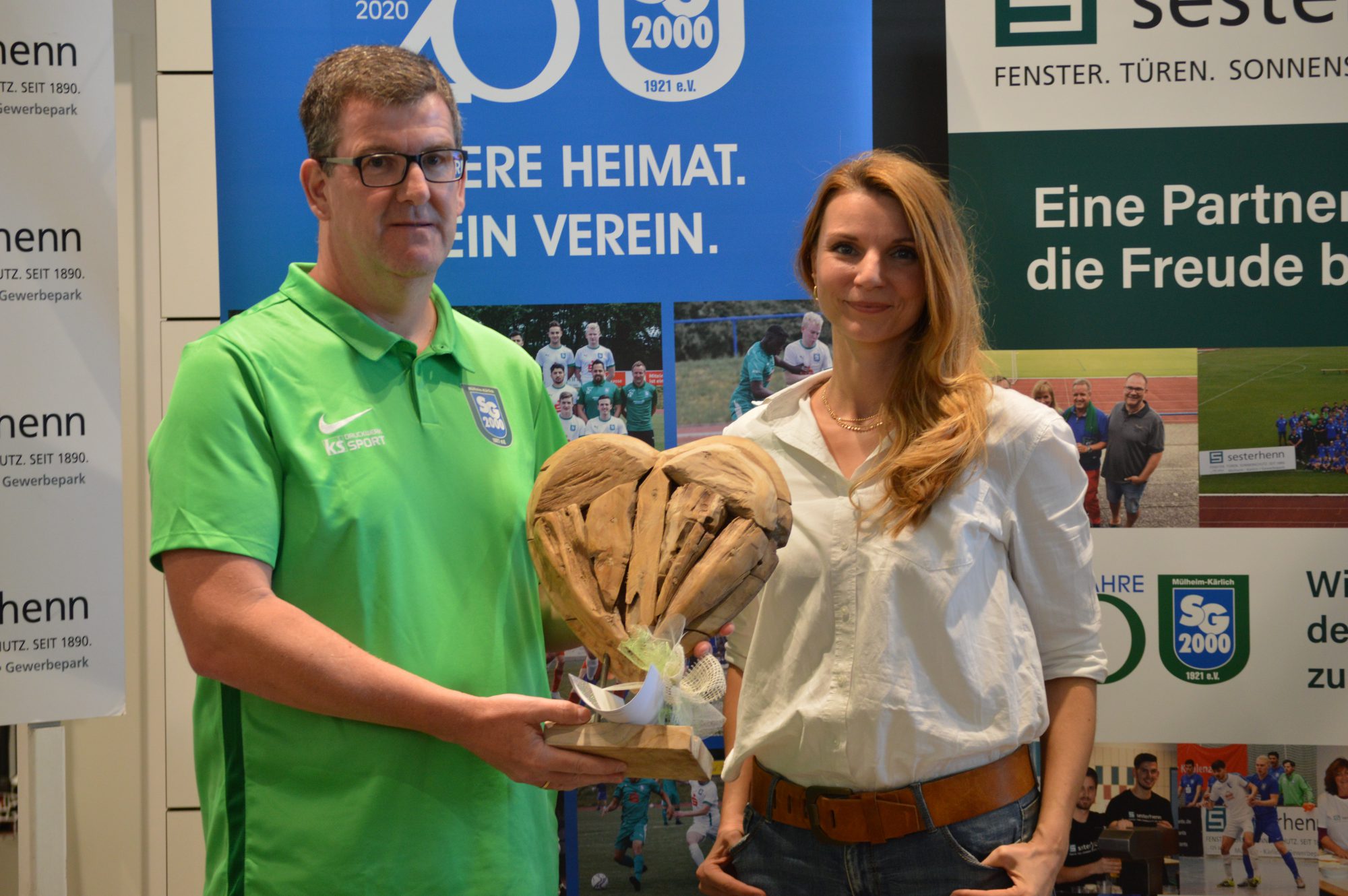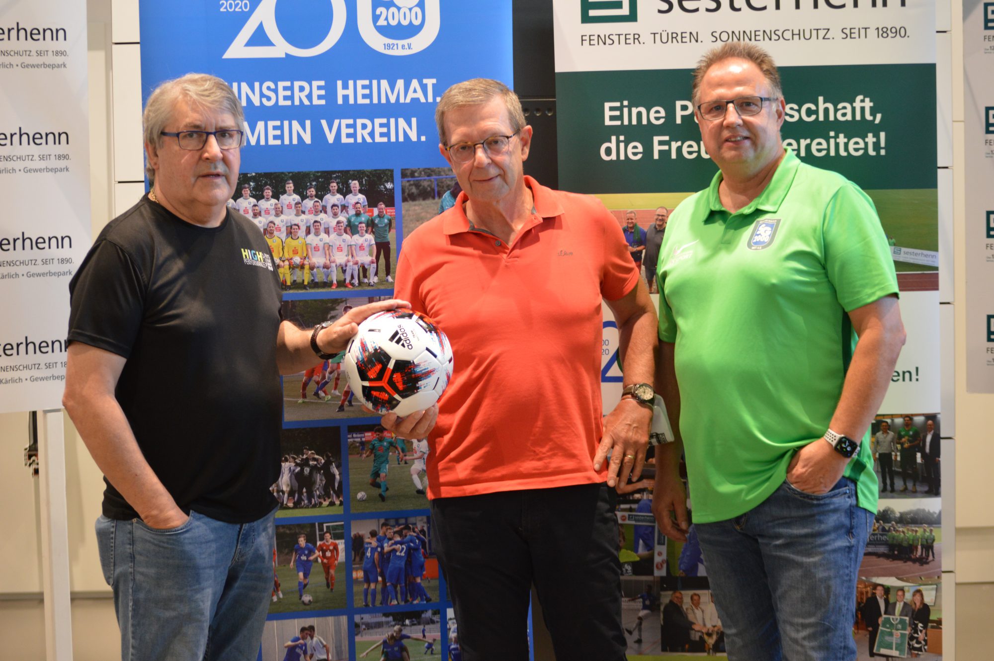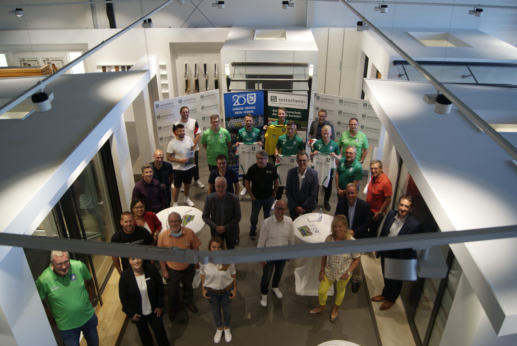 Die Überraschung gelang und die Premiere im Pokal dann auch. Tanja uns Johannes Sesterhenn hatten gemeinsam mit dem für Sponsoring zuständigen 2. Vorsitzenden Tom Theisen zu einem Empfang in ihrem Unternehmen eingeladen. Zum einen wurde im Rahmen der Möglichkeiten das 20-jährige Vereinsjubiläum gefeiert. Zum anderen wurde am Schluss das neue Pokaltrikot der 1. Mannschaft präsentiert. Maximal 30 Personen groß durfte der erlesene Kreis sein, „also unsere Hauptsponsoren, die Stadt- und Verbandsgemeindeoberhäupter, sowie Vertreter des Vereins“, erklärte Theisen. Die Sparkasse wurde vertreten durch Bernd Oster und stellvertretend richtete sich der Gastgeber an den Geschäftsstellenleiter in Mülheim-Kärlich. „Danke, dass die Sparkasse die Idee unterstützt und die Brust für die Pokalspiele frei gemacht hat.“ Normalerweise trägt die Oberligamannschaft das Sparkassen-Logo auf der Brust, das von Sesterhenns auf dem Ärmel. „Nur in den Pokalspielen wird es andersherum sein“, verriet Initiator Tom Theisen. „Für den durch die fehlenden Einnahmen gebeutelten Verein eine wichtige neue Einnahmequelle.“ Gemeint war die Corona-Krise und die damit zusammenhängenden Beschränkungen. „Uns fehlen Sommerevents, Heimspieleinnahmen und mit Sicherheit auch die Hallenturniere im Winter“, musste festgehalten werden. „Ihr schafft das trotzdem“, sprach Stadtbürgermeister Gerd Harner den Vereinsverantwortlichen Mut zu. Gemeinsam mit Verbandsgemeindebürgermeister Thomas Przybylla machte Harner der SG 2000 auch Hoffnungen in Sachen neue Spiel- und Trainingsstätte im Schul- und Sportzentrum. „Dieser rege Verein hat sich Unterstützung nachhaltig verdient.“