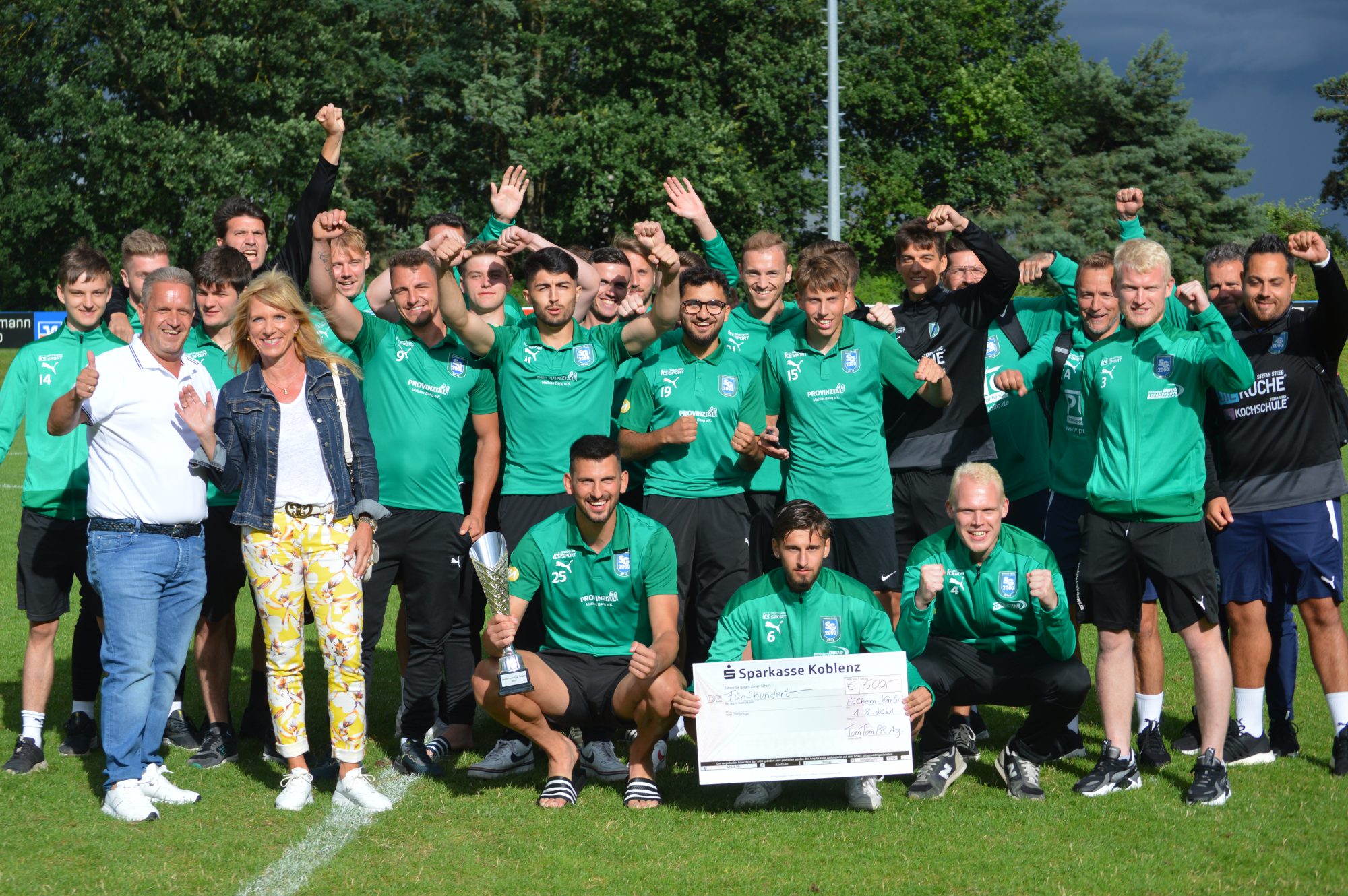 Ein Blitzturnier mit drei Mannschaften kam zustande, für die SG Fans eine willkommene Gelegenheit ihr Team unter Wettkampfbedingungen, zwei Wochen vor dem Oberliga Start zu erleben. „Eine runde Sache“, befand Johannes Sesterhenn, der zudem erfreut war, das heimische Team in den Pokal Trikots, mit seiner Werbung auf der Brust, zu sehen. „Unser dank gilt hier der Sparkasse Koblenz , die unserer Anfrage direkt zugestimmt hat“, so der 1. Vorsitzende Bernd Müller.